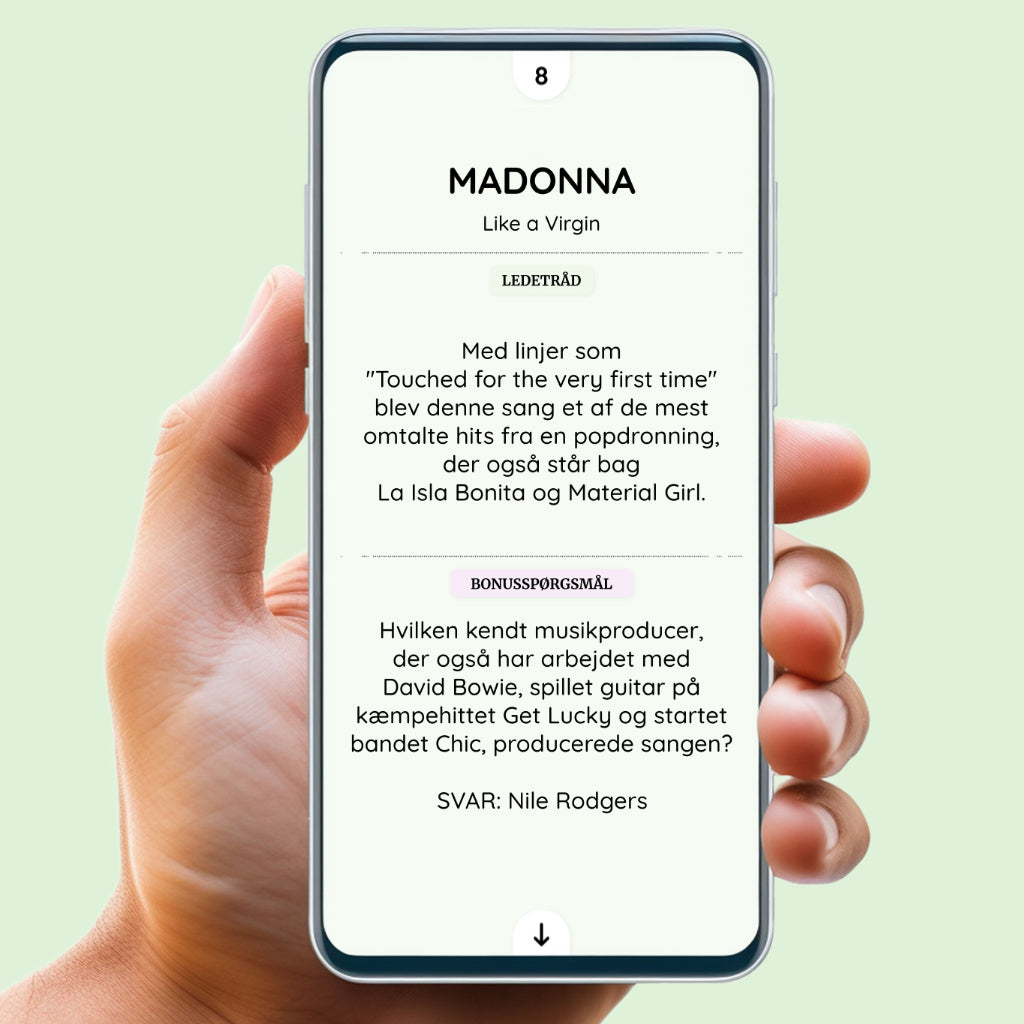 Som quizmaster skal du tage dine deltagere med på en tur direkte ind i 80’ernes spraglede musikunivers. Her venter 20 ikoniske sange som Sweet Child O’ Mine og You Can Call Me Al, der sender jer tilbage til en tid med stort hår, endnu større følelser og synthesizere i fuldt flor.